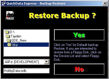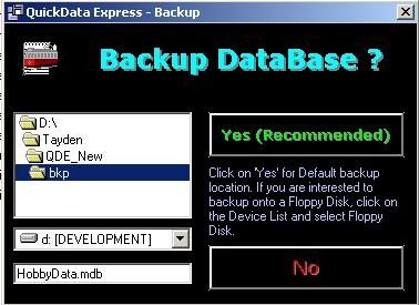 QuickData Express™ is equipped with an advanced backup system. Each time user is exiting the program, the system recommends to backup the database. In additional user may backup directly from the program using the 'Backup' button or the 'Restore' option from the 'Setups' pull down menu.